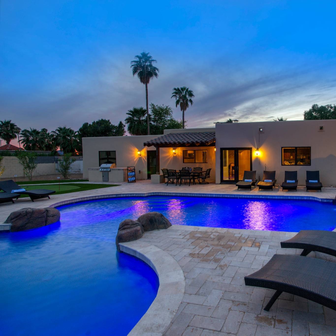 This beautiful Scottsdale home boasts amazing accommodations for your family, including a private, large, heated pool with a lazy river, and a game room. When you enter the home, you will be ready to entertain. The main house offers its occupants five bedrooms, and 3 and a half bathrooms which include two master suites. Both suites have king beds with en suites and direct access to the outdoor amenities. In the other bedrooms, there are two queen bedrooms and one bunk room with a twin over twin bed and a twin over full-sized bed. The living room opens up to a patio that allows for easy entertaining with large groups. This is a perfect spot for those large family dinner nights when you want to eat in versus having to reserve reservations at one of the local nearby restaurants. Off to the side of the living room is a walk-in wine cellar that can hold over 600 bottles of wine with climate control. This home also has a built-in office and podcast setup. The large kitchen is perfect for preparing a grand meal for your guests or for those who hire a private in-home chef to do the cooking for them. This kitchen features a double oven, a large refrigerator and freezer, and a gas cooktop. There is also plenty of storage and prep room which includes a butler’s pantry. Just out the back doors, past the pool area, you will find the casita with two bedrooms and one full bathroom. The pool area is the perfect place to spend a relaxing day floating in the lazy river. Stop by the bar on your trip around the river for a refreshing drink during the beautiful sunny days. The spa bar is another awesome feature to relax in after a long day out in the area. The spa hot tub has bar seas built-in. Off to the side of the pool area, there is a basketball and pickleball court. Turn on the lights over the court and play during the cool desert evenings. This home is perfect for a large group or family looking to enjoy Scottsdale.