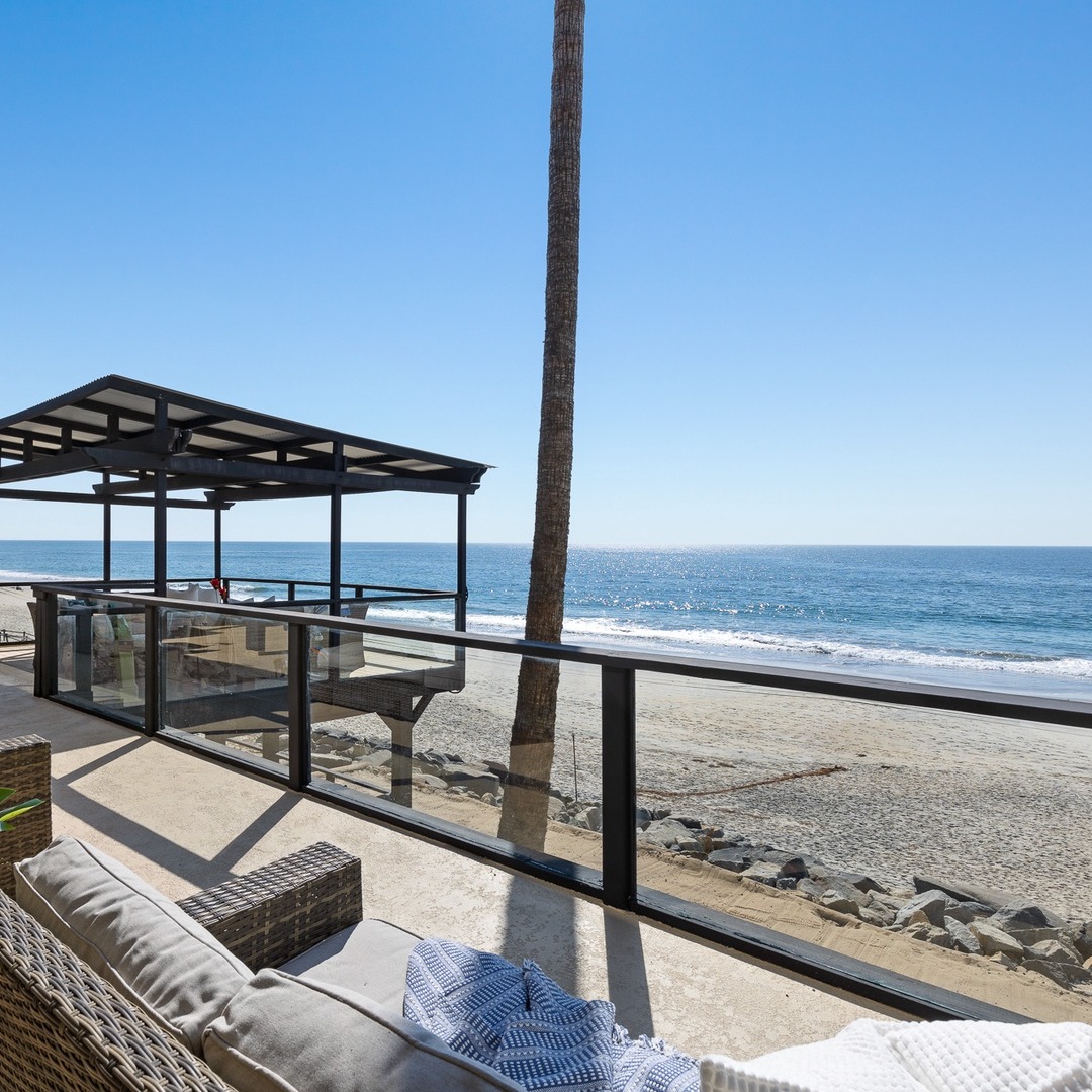 All homes in Oceanside, CA sit behind a rock barrier protecting the homes from storm surges. The amount of sand beyond the rock barrier varies quickly with storms and tides and may have more or less sand than what is shown in the photos