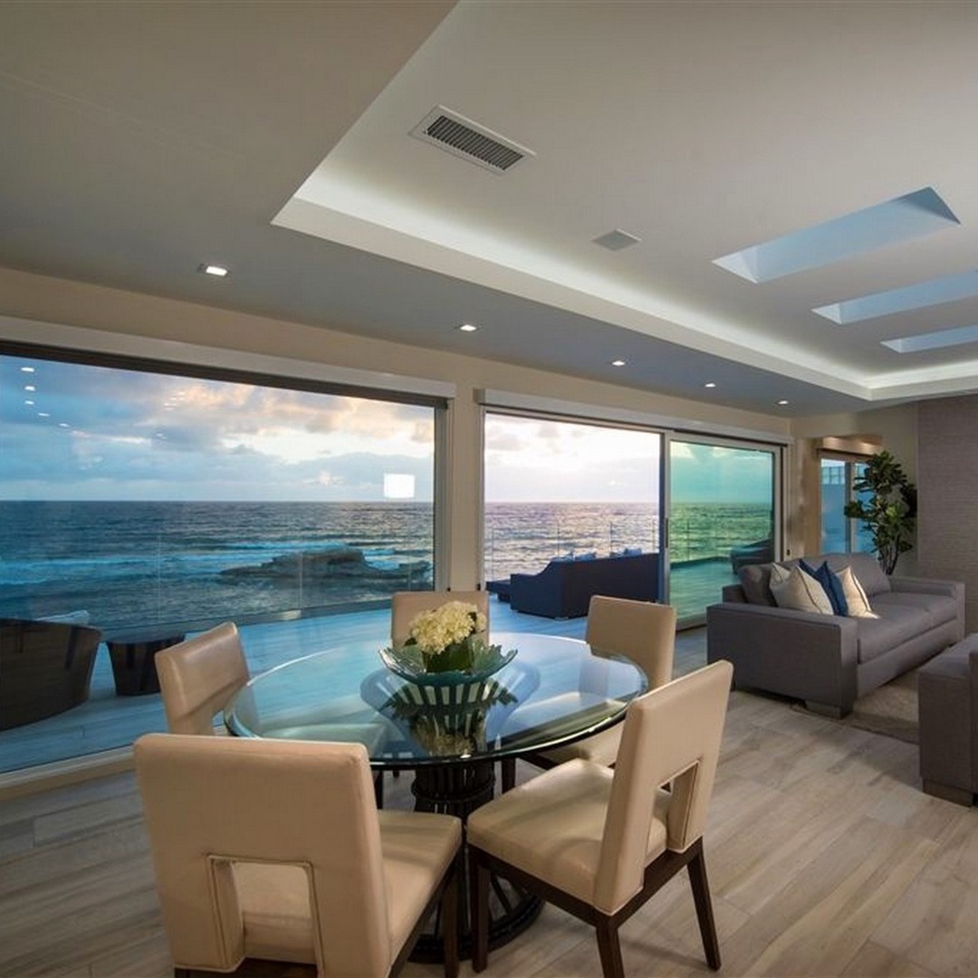 Gated and private, this home was newly re-built in 2017 with full attention to detail. Single-level living is a breeze with no stairs to navigate and the home flows from one area to the next. Clean, white walls and surfaces, smooth finishes, a chef’s kitchen, and a lounge living room, combine to create a space that feels like a luxurious contemporary hotel that is warm and inviting at the same time. The home has three spacious bedrooms and features two king bed master suites, with a spa-like soaking tub as a centerpiece. The oceanfront master is an amazing space with a fireplace, a convenience fridge, and floor-to-ceiling sliding glass doors that open to the sea. San Diego is known for its incredible weather, and this home is designed to take every advantage. The interior courtyard has space for an outdoor dining area leading to the entry breezeway complete with an oversized flat-screen TV over an elongated glass-filled fireplace. Enter the home through a large single-pivot glass door, pass through the open floorplan and glass La Cantina doors to the highlight of the home, a property-wide waterfront terrace, complete with lounge seating, two fire pits, and a hot tub. From here, you’ll enjoy the sights of the blue ocean, whitewater waves, and golden sunsets with the calming sounds of the surf breaking on the reefs beyond.